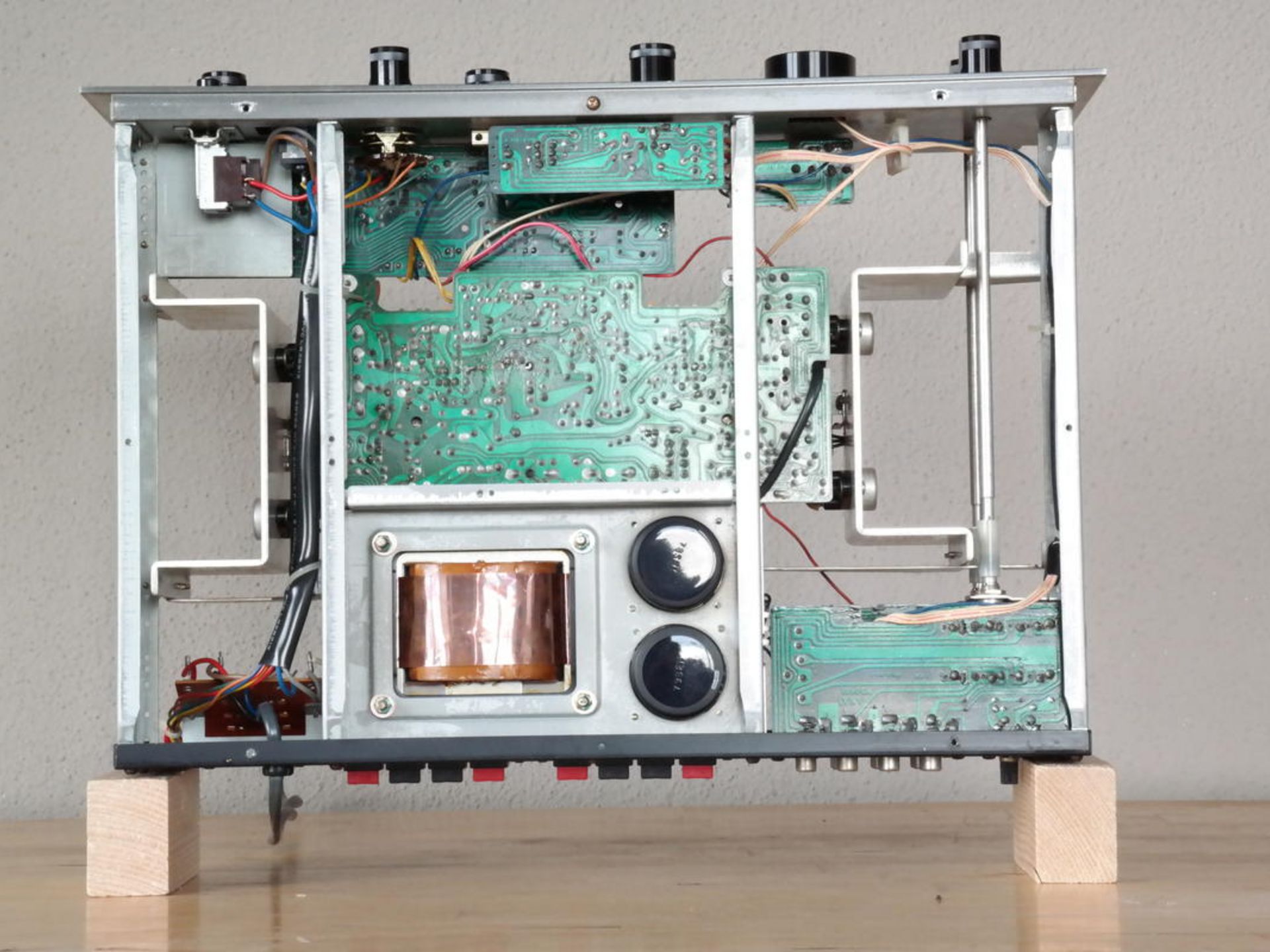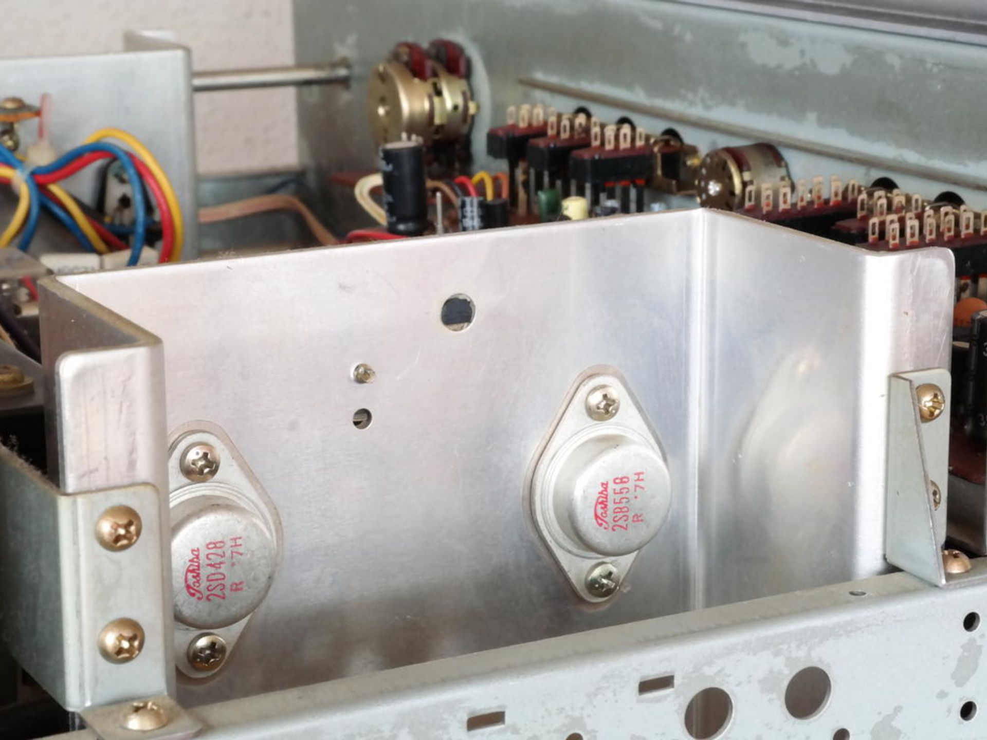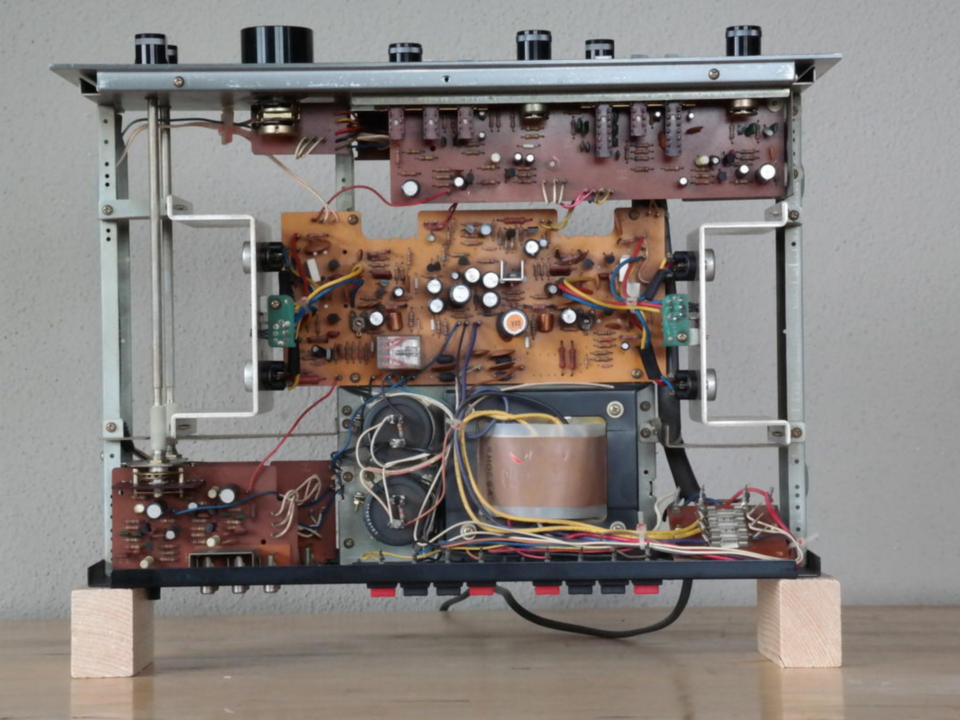 Anschlüsse für zwei Lautsprecherpaare, zwei Tape-Decks. ein Plattenspieler, Tuner und Auxiliary. Endstufe besteht aus 4 Transistoren.