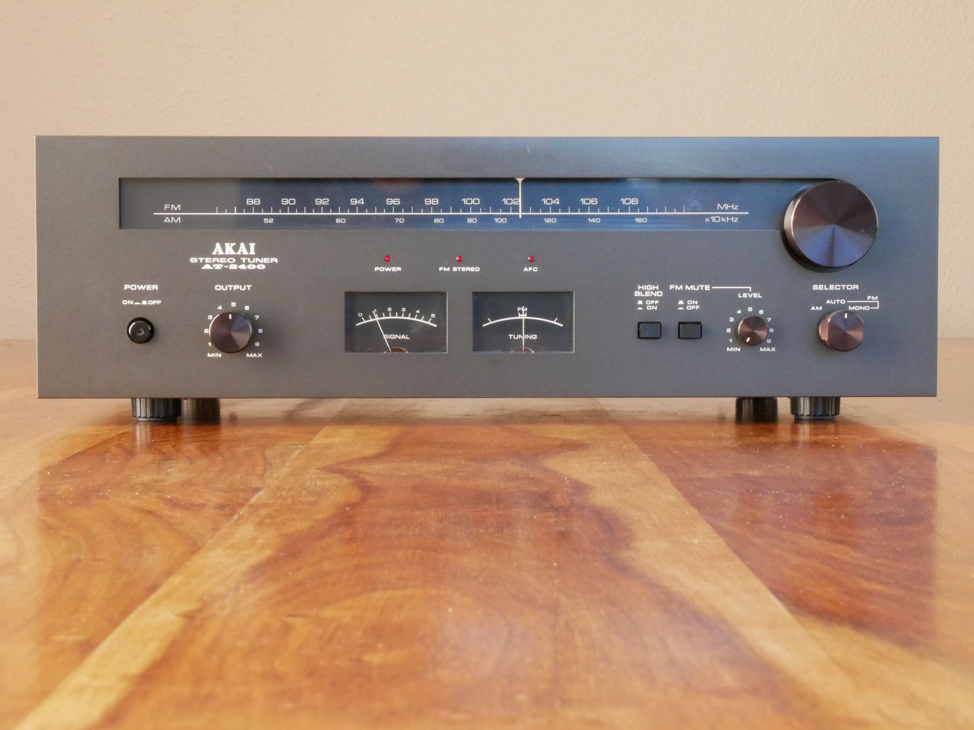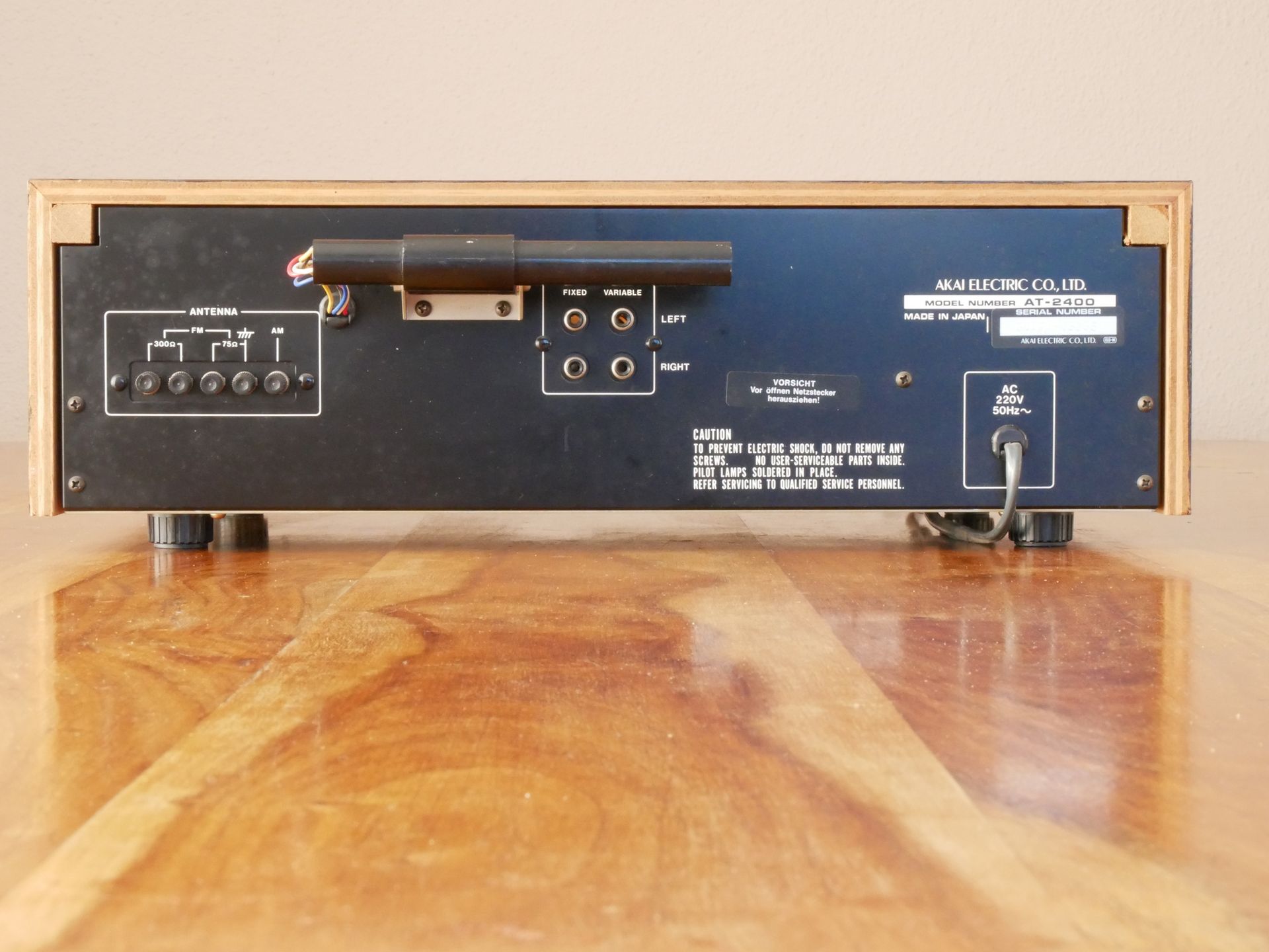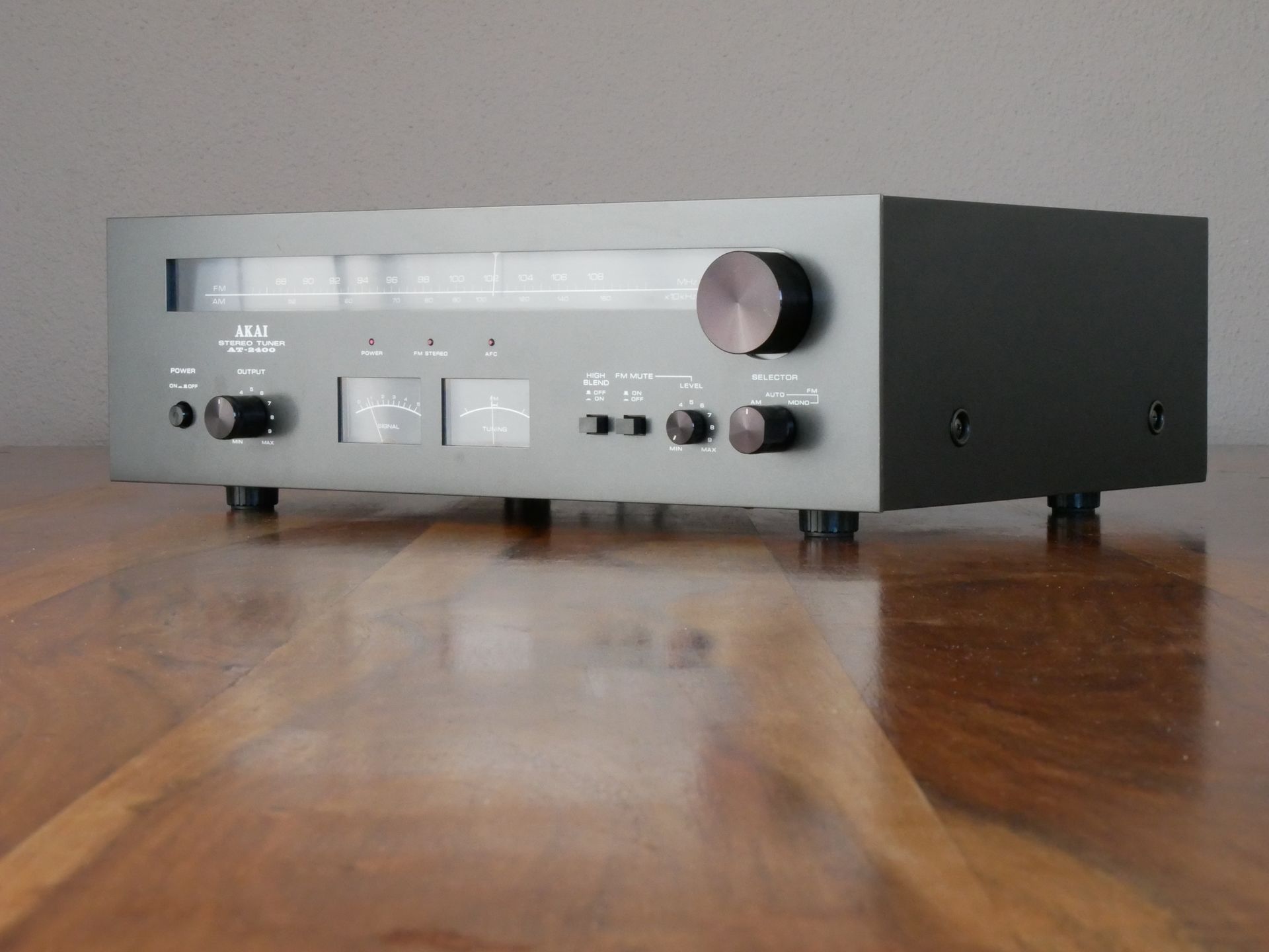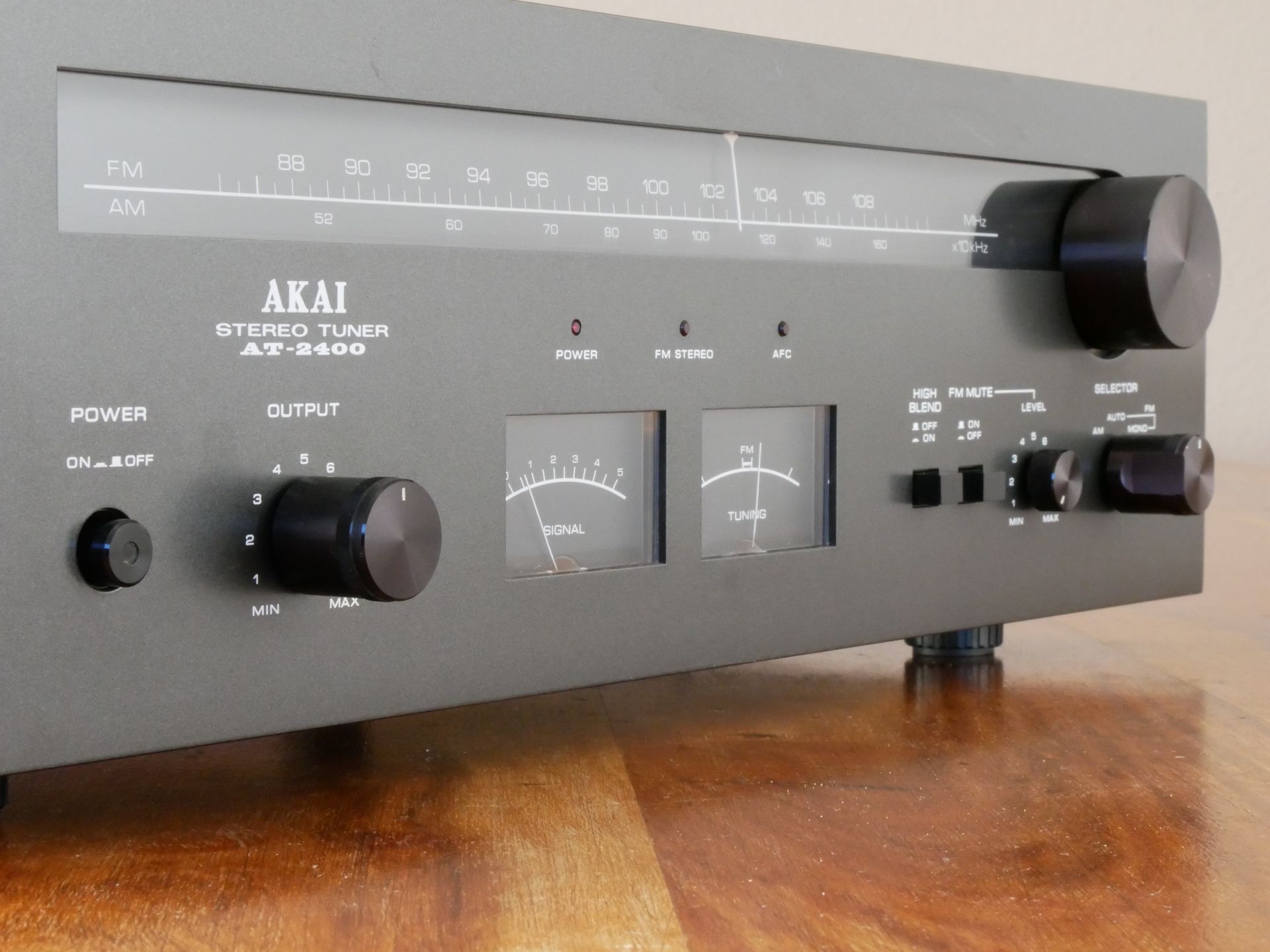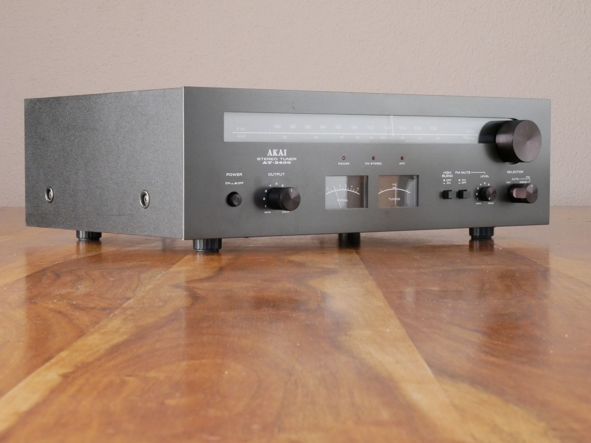 Dieser Tuner ist Kult. Gut verarbeitet, Das Radio war zusammen mit dem passenden Amplifier und Tape-Deck die HiFi-Kombination von Lehrer- und Architekt*innen Ende der 70 Jahre. Der AKAI AT-2400 hat eine eloxierte Aluminium-Front und ein Holzgehäuse. Er ist von 1978 und gut 45 Jahre alt.