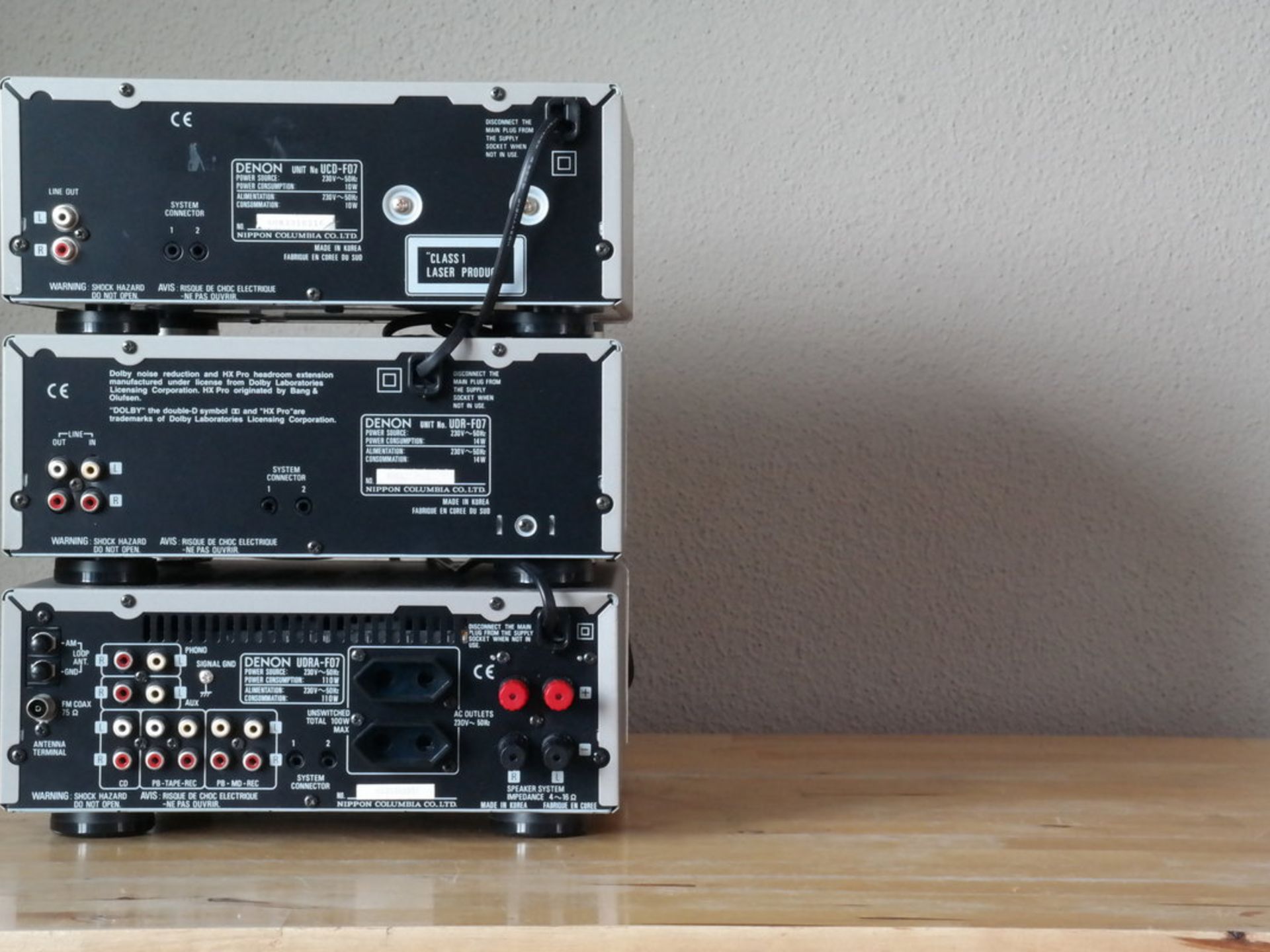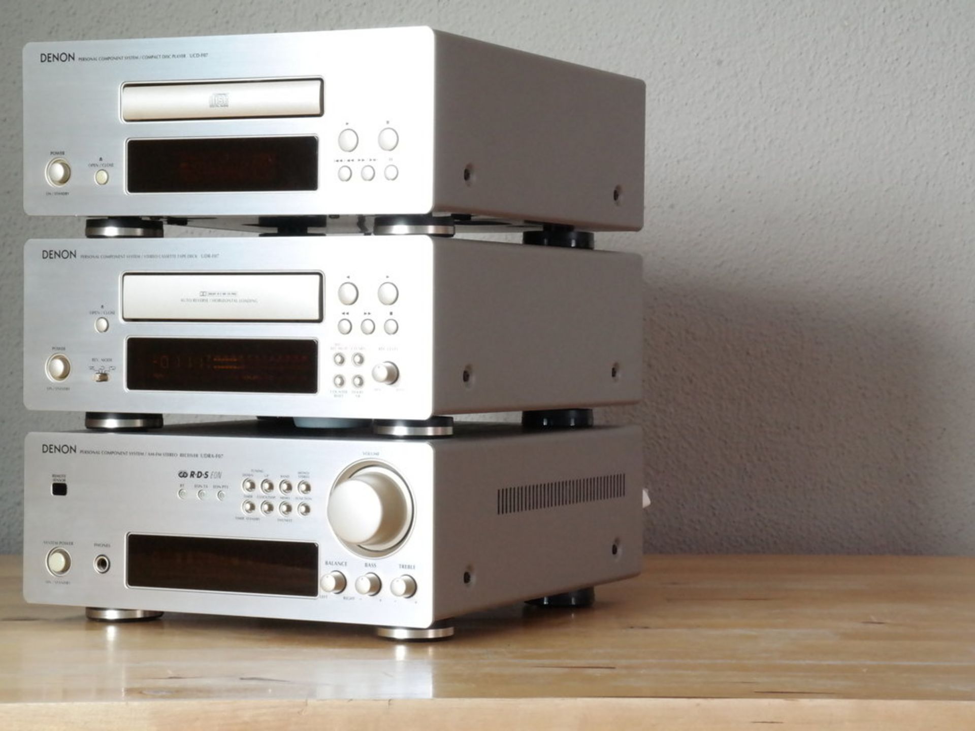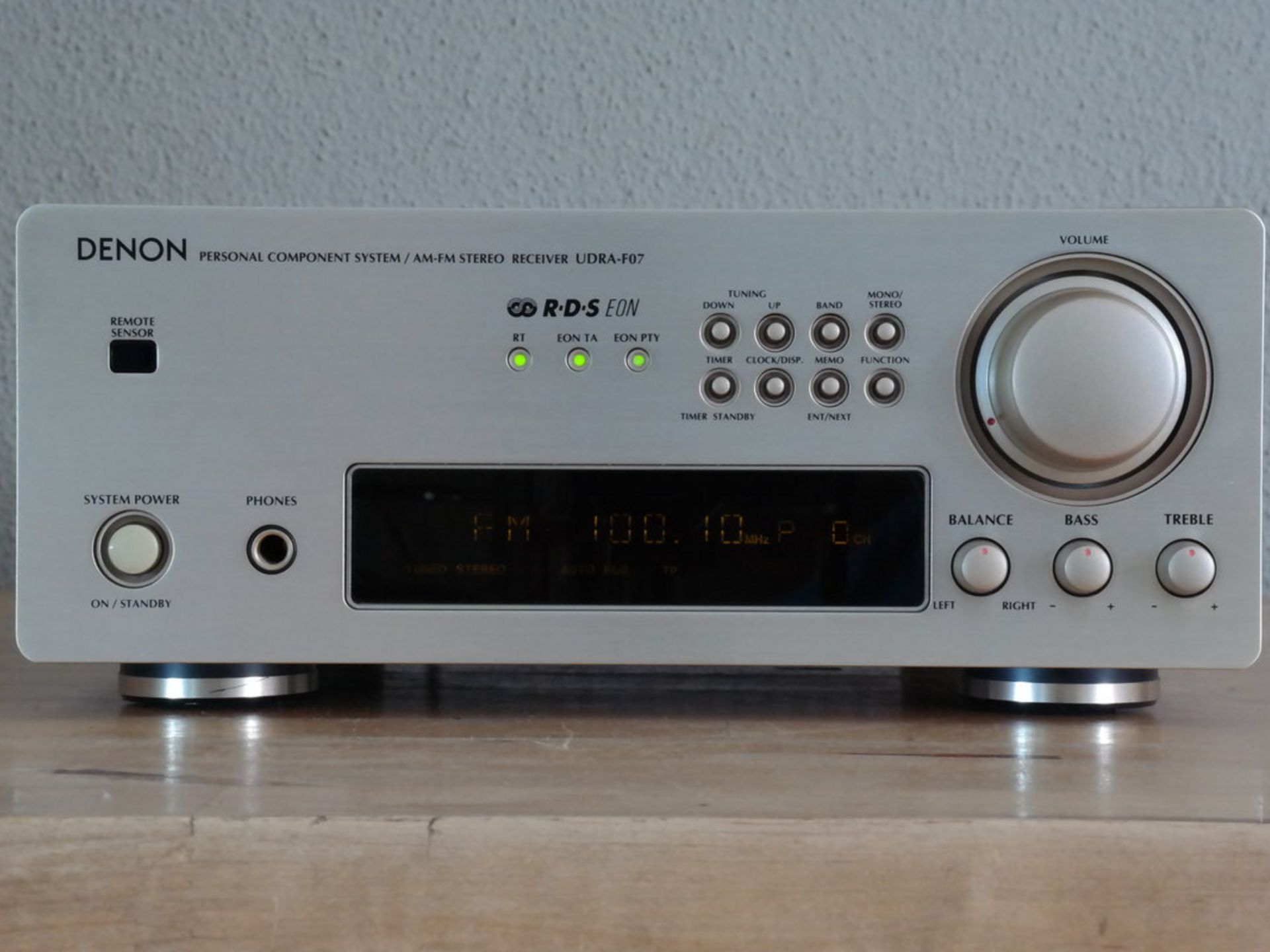 Denon-MIDI-Anlage. Der Receiver hat mit 2 x 45 Watt ordentlich Power, RDS zeigt die Namen der Radiosender an. Edle Front in gebürstetem Aluminium. Die Anlage ist schätzungsweise von Anfang der 1990er Jahre.